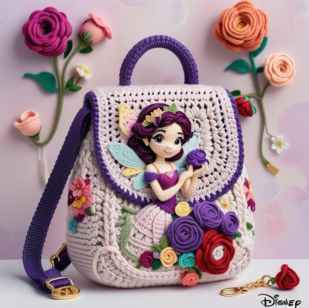 Prenses Figürlü Çiçek Desenli Örgü Sırt Çantası (6)